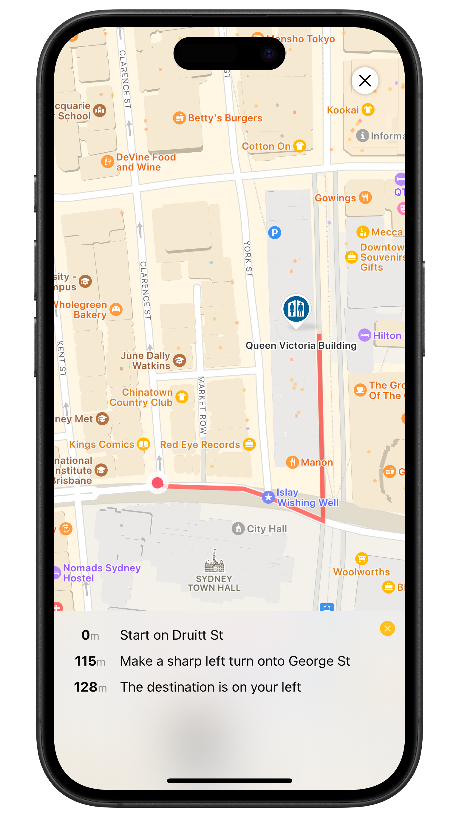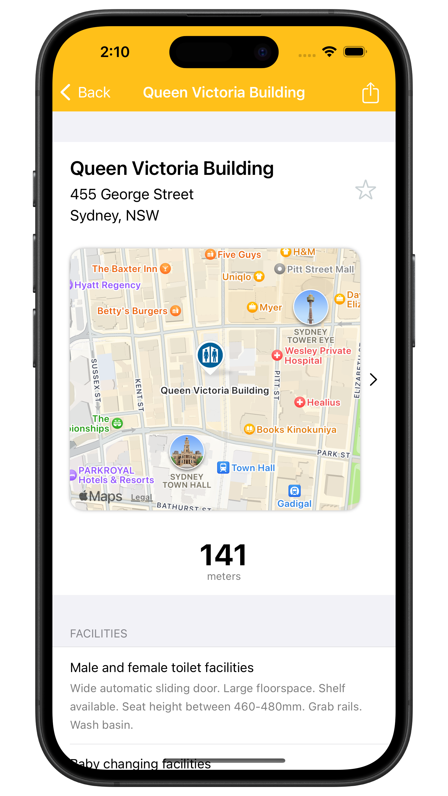 - Calculate the best walking or driving route to the selected facility in either the Apple Maps or Google Maps app.
