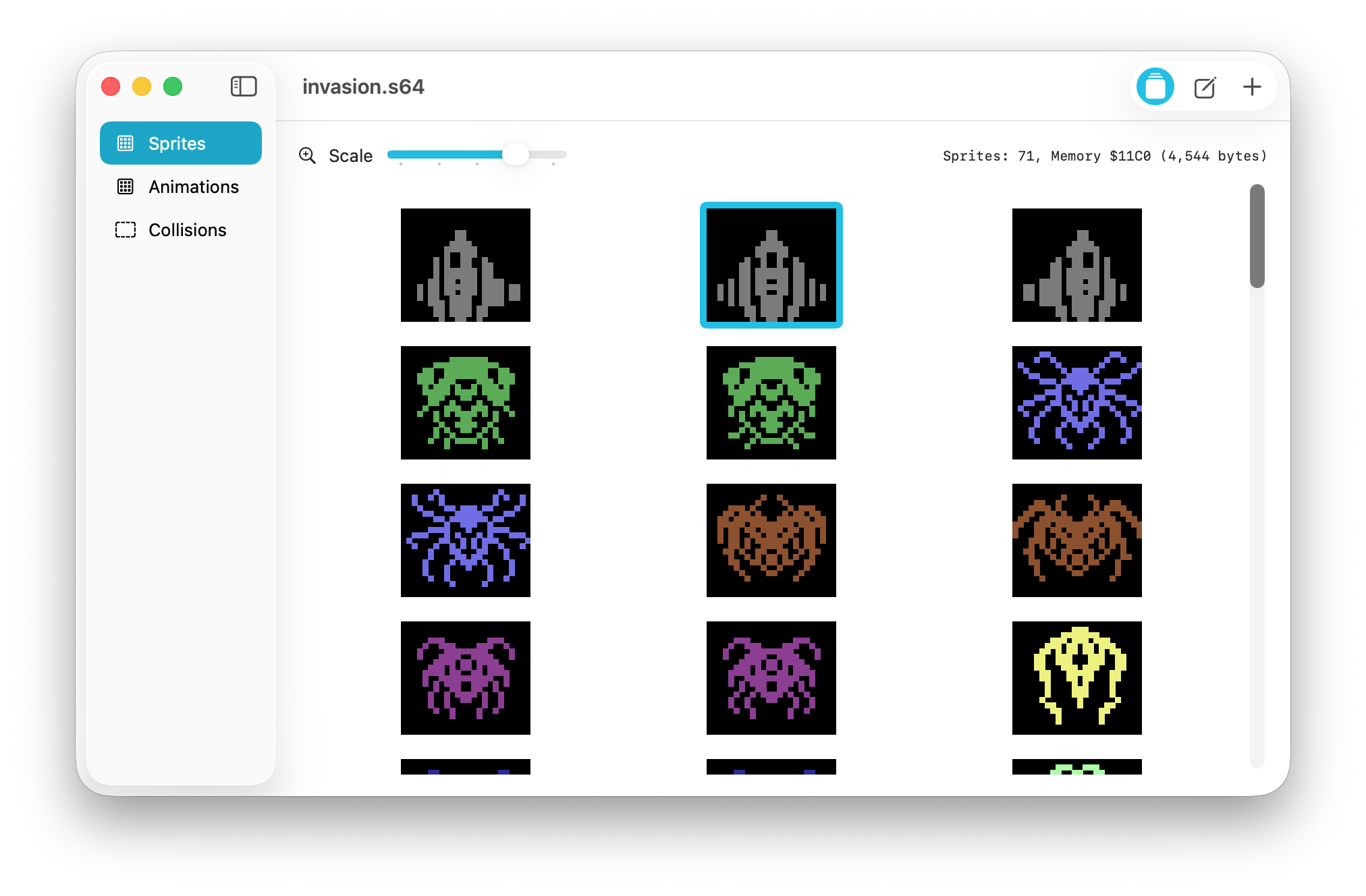 - Edit sprites in hi-res or multicolor mode, with or without an overlaid sprite (which can be to add more color and detail to your sprites), easily toggling between the sprite and the overlay allowing you to quickly draw multicolored, hires sprites (see our game Freaky Fish DX for the Commodore 64 for an example of the type of sprites this editor is designed for).