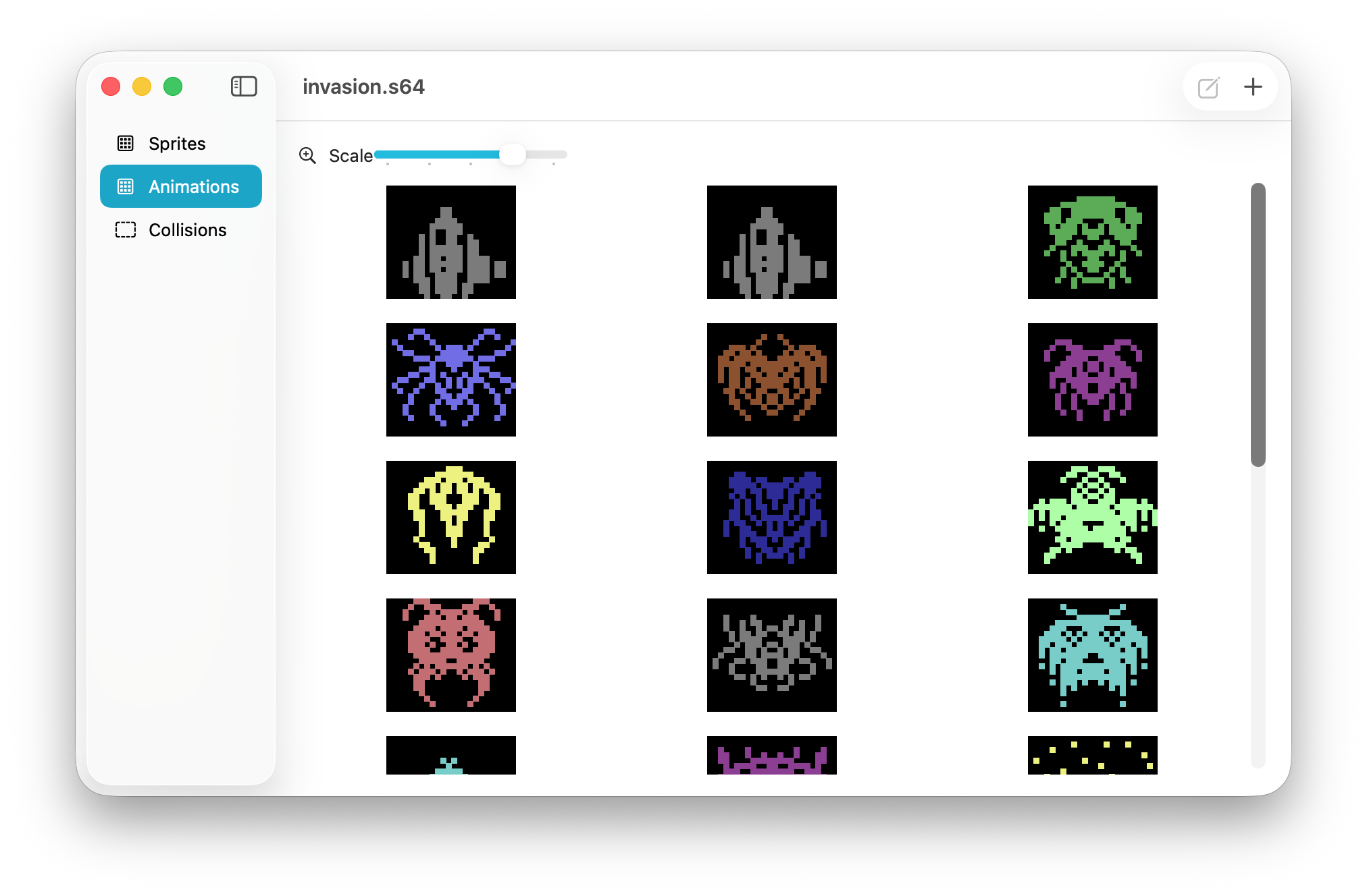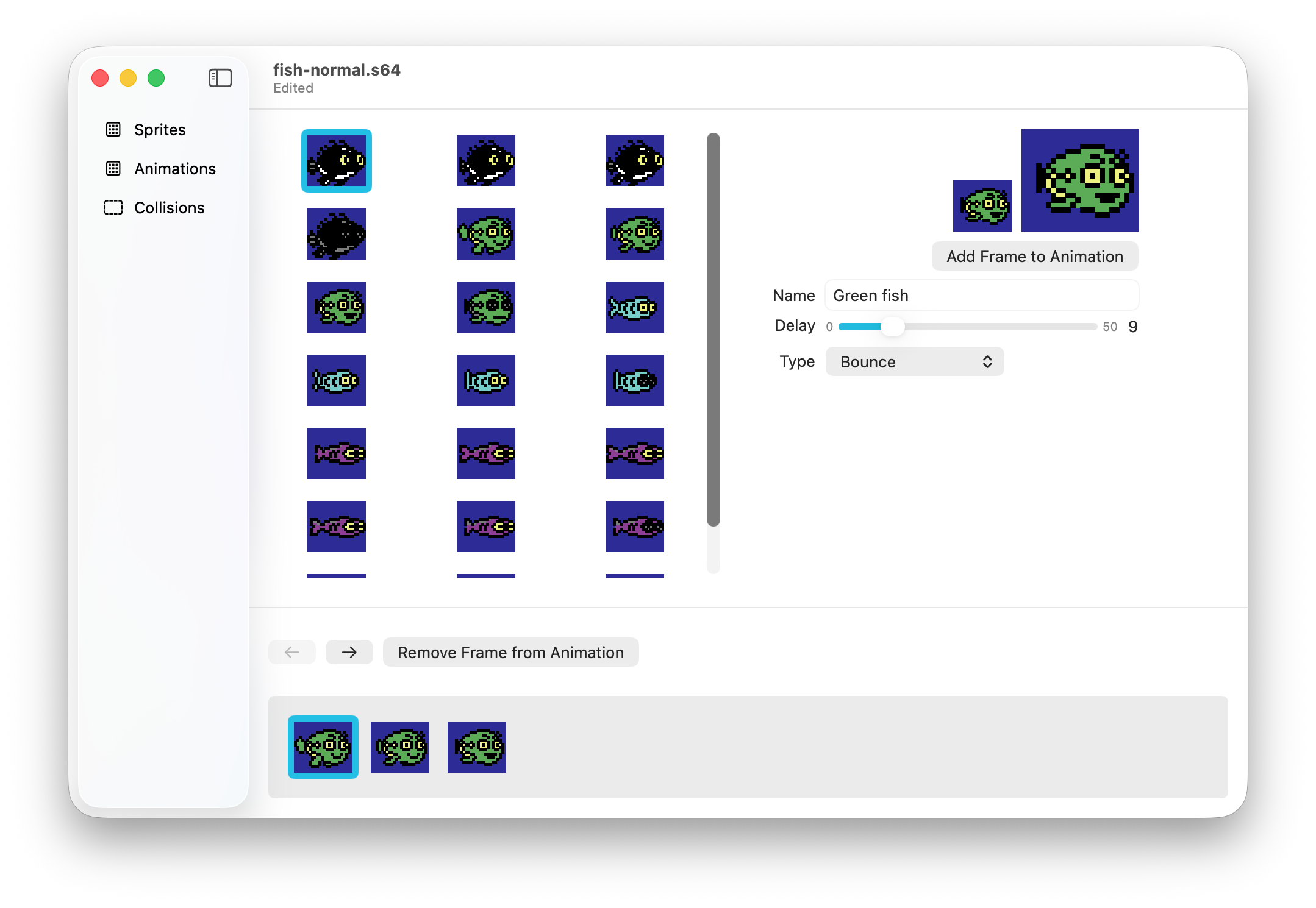 - Export metadata for sprites, animation and collision to a text file for use with your own game engine.