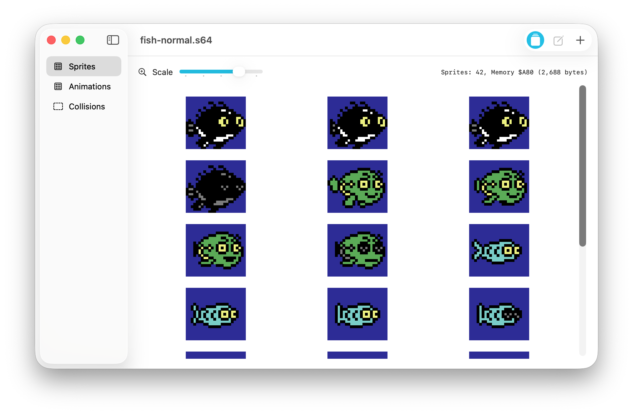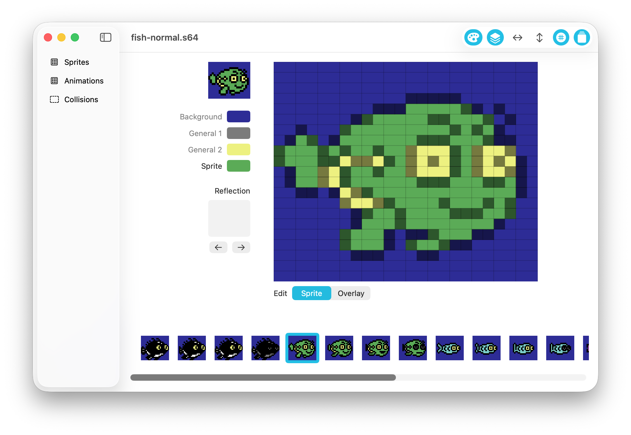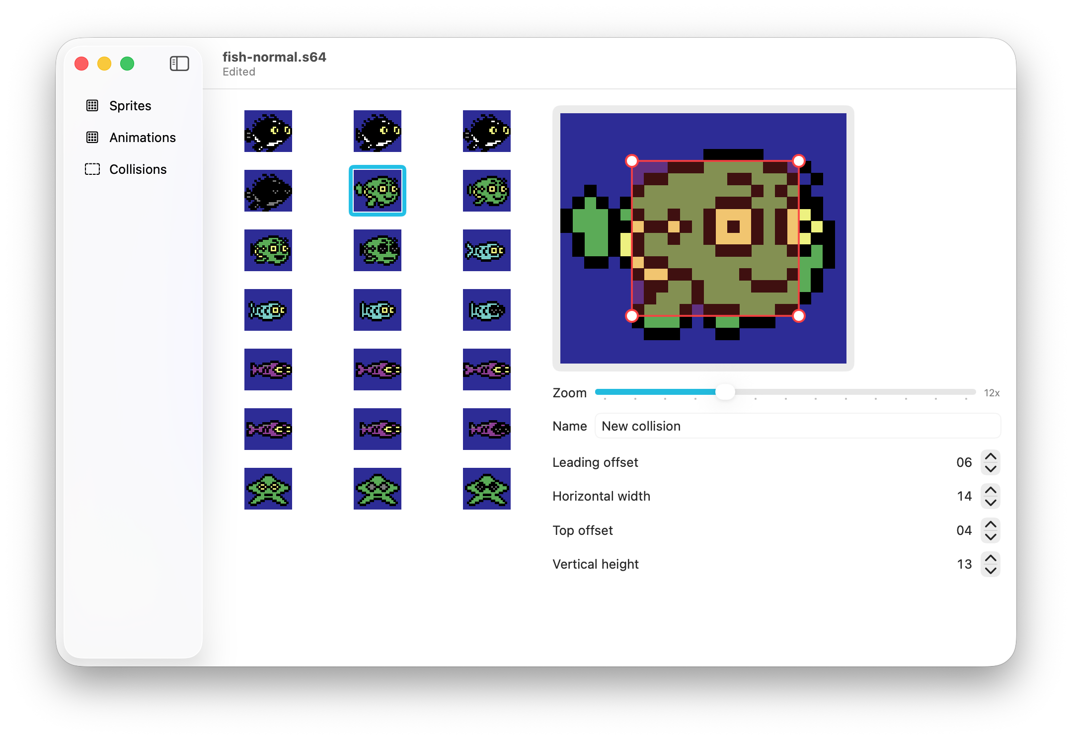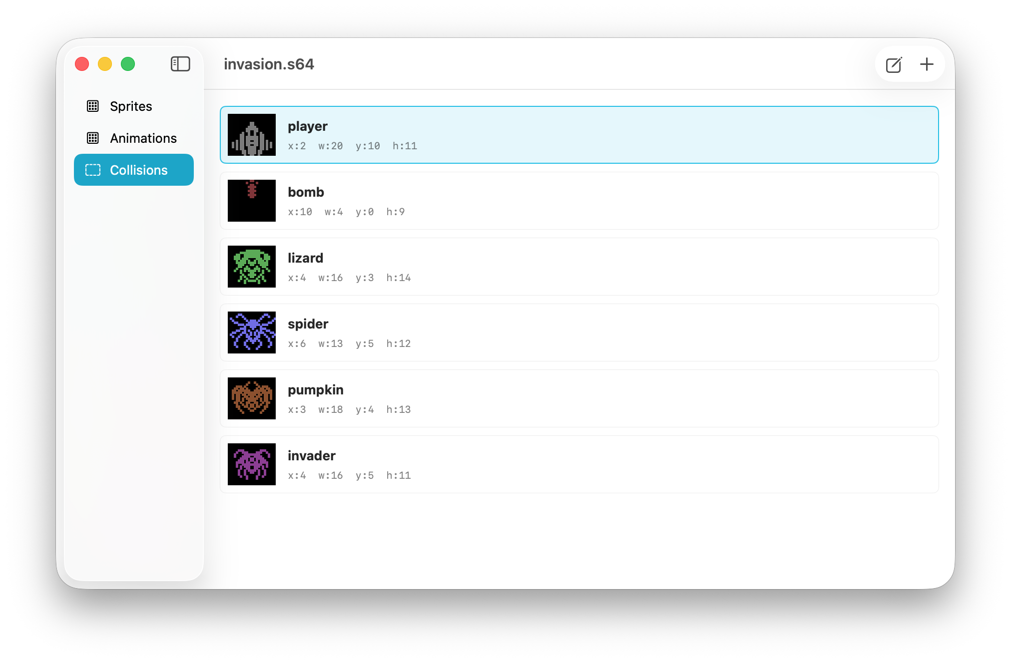 Sprite64 is a MacOS document-based editor for creating and managing Commodore 64 sprite assets. It focuses drawing sprite frames, organizing sprite sheets, defining animations, and authoring collision rectangles tied to sprites.
